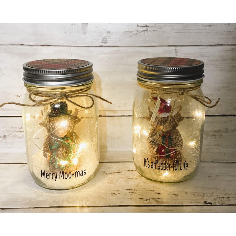 AGD Christmas Decor - Highland Scottish Cow Lighted Mason Jars 2pc