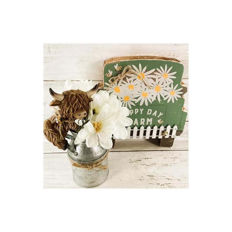 - Die Cut Truck Sign - 7 x 7 x 1-inch approx. Highland Cow Milk Can Display - 7.5 x 3.25 x 3-inch approx.