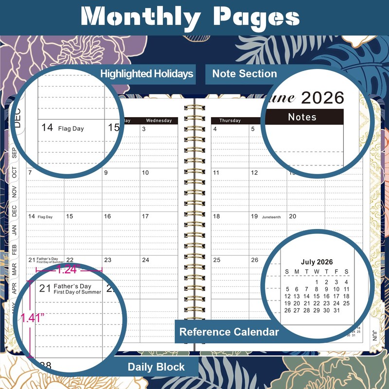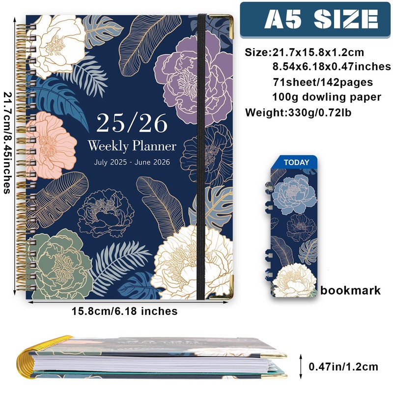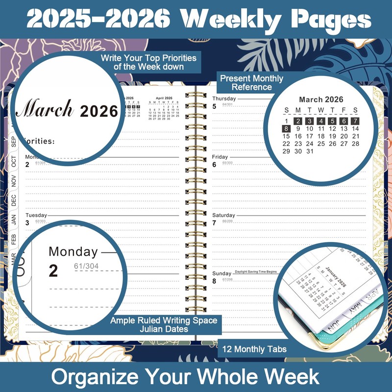 - UNIQUE & PRACTICAL DESIGN: Our 2025-2026 weekly planner features a sturdy hardcover with metal corner guards to prevent pages from creases or wrinkles. Its robust twin-wire binding allows for a full 360° flip and enables it to lie flat, ensuring smooth writing. Monthly tabs are added for rapid schedule access. The back pocket is handy for storing cards, letters, and tickets