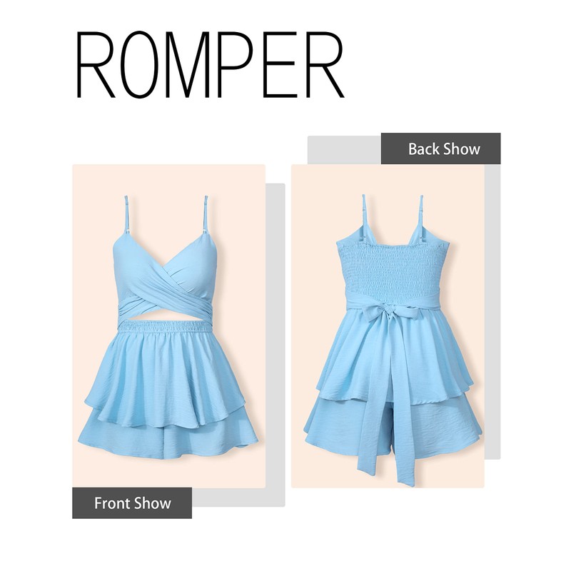 - Chic Design - Adjustable spaghetti straps, v neck, smocked Waist, cutout, long strap around the waist allows for knot and tightness adjustment, solid color, double layer ruffle hem. Casual rompers for women, but with the confident elegance of a dress.