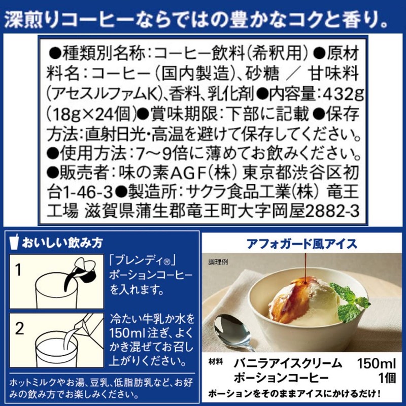 - How to drink deliciously: Dilute to 7 to 9 times. 1. Fill with "Blendy" portion coffee. 2. Pour 150 ml of cold milk or water and stir well before consumption. Enjoy your favorite drinking method, such as warm milk, hot water, soy milk, almond milk, etc