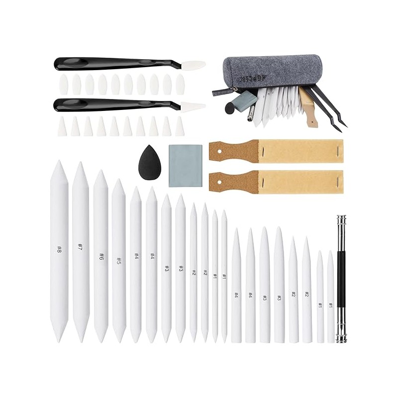 AGPTEK 48 PCS Sketch Drawing Tools, 20 Blending Stumps Set and 2 Sandpaper Pencil Sharpeners, Pencil Extension, Erasers,20 sponge replacement heads & 1 Felt Bag for Student Sketch Drawing Accessories