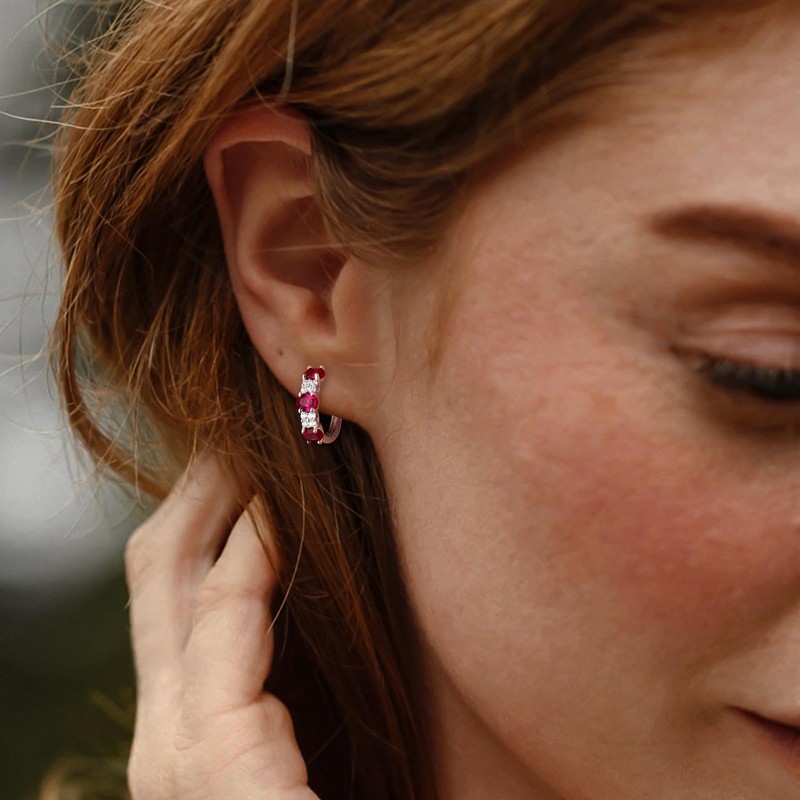 AGRULE Ruby Red Earrings 14K White Gold Plated Chunky Hoop Earrings Sterling Silver Post 13.5mm Huggie Hoops Created Red Ruby Stone Hoop Earrings for Women