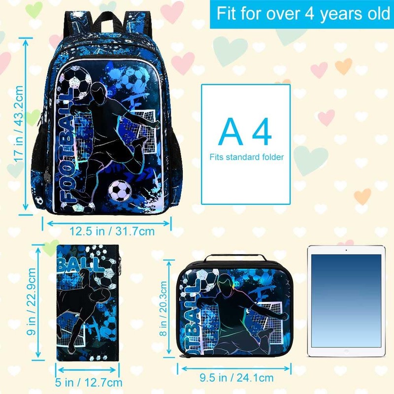 - Boys Backpack 3 in 1: The boys bookbag set with football UV printing, inclduing boy backpack: 17 "x 12" x 6 ", lunch box: 9.7 "x 8.5" x 4 ", pencil bag: 9 "x 4.7" x 0.5", ideal for primary and secondary school students.