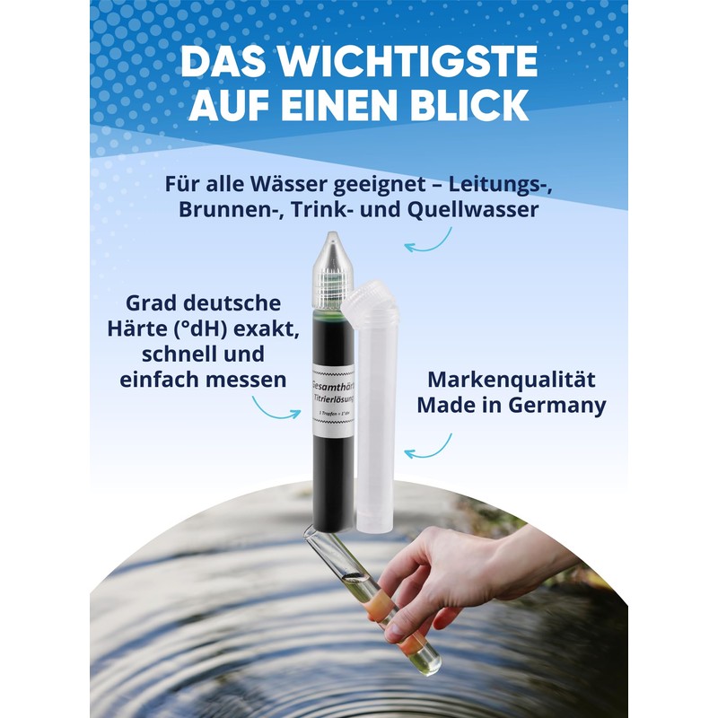 - Precise results thanks to the proven titration process, quick and easy: fill the supplied container with sample water and add the titration liquid drop by drop until a colour change from red to green occurs. 1 drop of titration liquid corresponds to 1° German hardness (dH). For example: colour change from red to green for the 7th Drop = 7° German hardness (°dH). If the water is directly at the 1st drops of green, the water hardness is 0° German hardness (°dH).