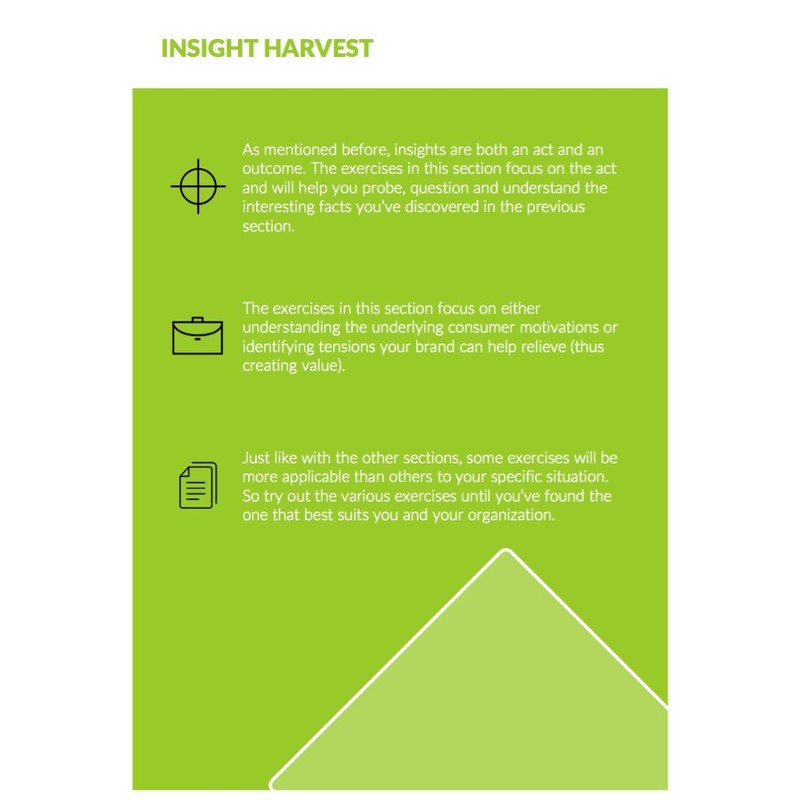 - 4 tarjetas de método "Insight Harvest" que te ayudarán a convertir datos e información interesantes en perspectivas. Estos ejercicios probados te animarán a profundizar en las motivaciones humanas subyacentes a los datos, así como a identificar posibles tensiones que tu marca puede ayudar a resolver. Si hay una visión en tus datos, estos ejercicios te ayudarán a descubrirlos.