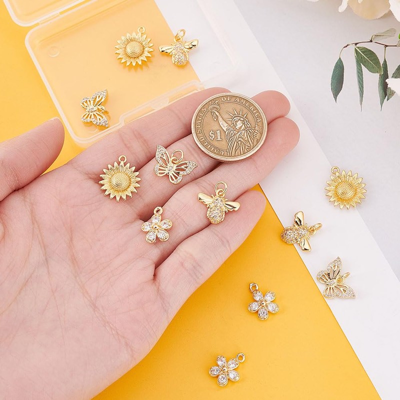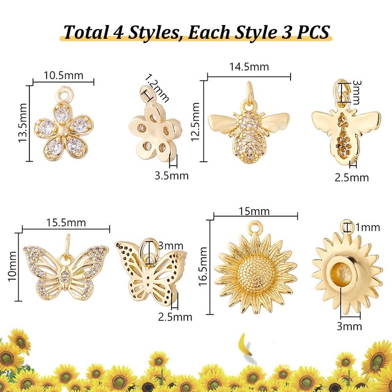 AHANDMAKER Pack of 12 Butterfly Charms, Flowers & Bee Charms, 4 Styles, Golden Pendants with Bows, Dangling, Cubic Zirconia Pendant for Jewellery, Necklaces, Key Chain, Brass and cubic zirconia