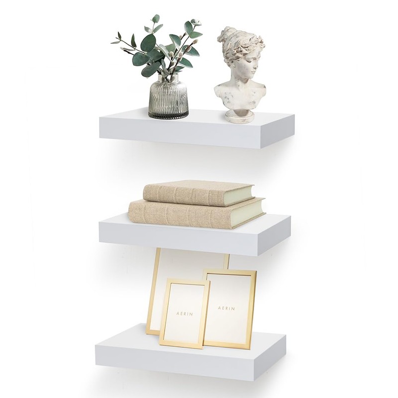 AHDECOR White Floating Shelves Set of 3 - Modern Wall Mounted Shelves for Living Room, Bedroom, Bathroom, Kitchen, Office - Space-Saving and Decorative Storage Solution