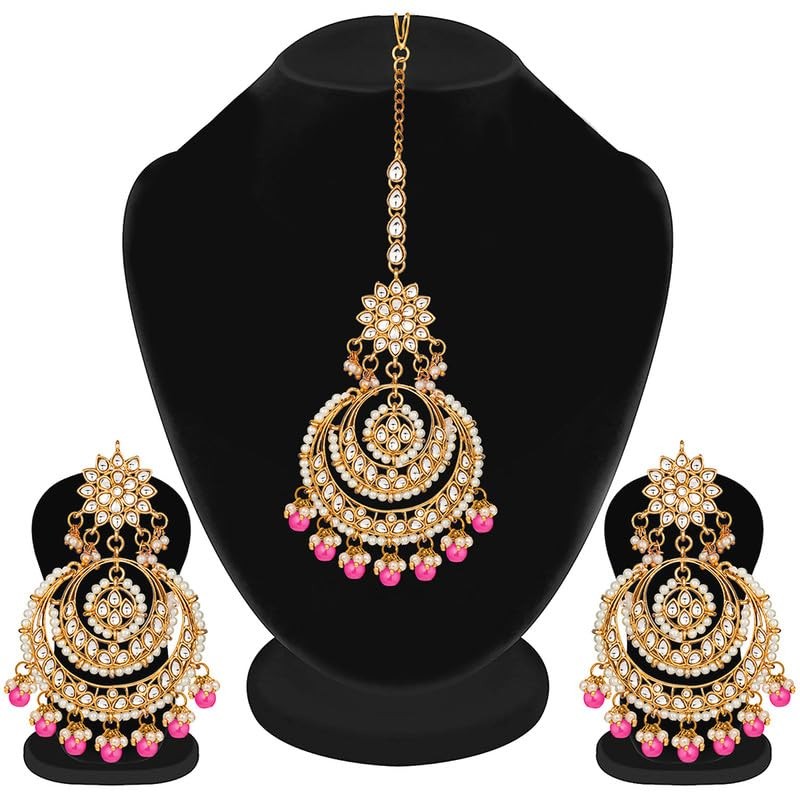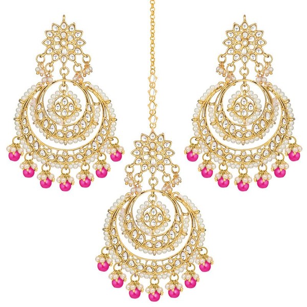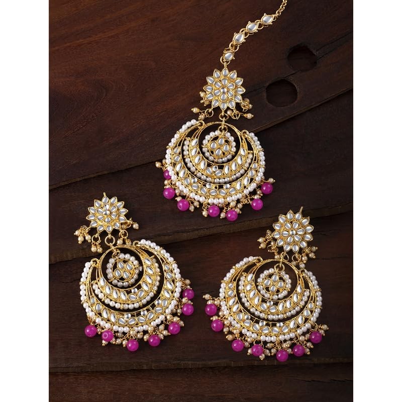 Aheli Bollywood Ethnic Chandbali Style Big Earrings Maang Tikka Set Traditional Fashion Jewelry for Women Dark Pink