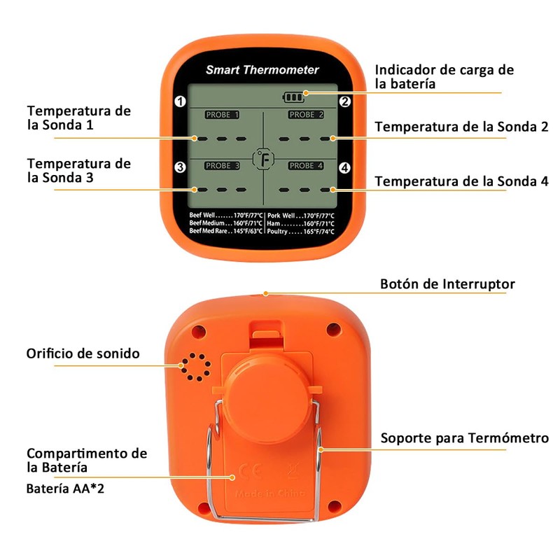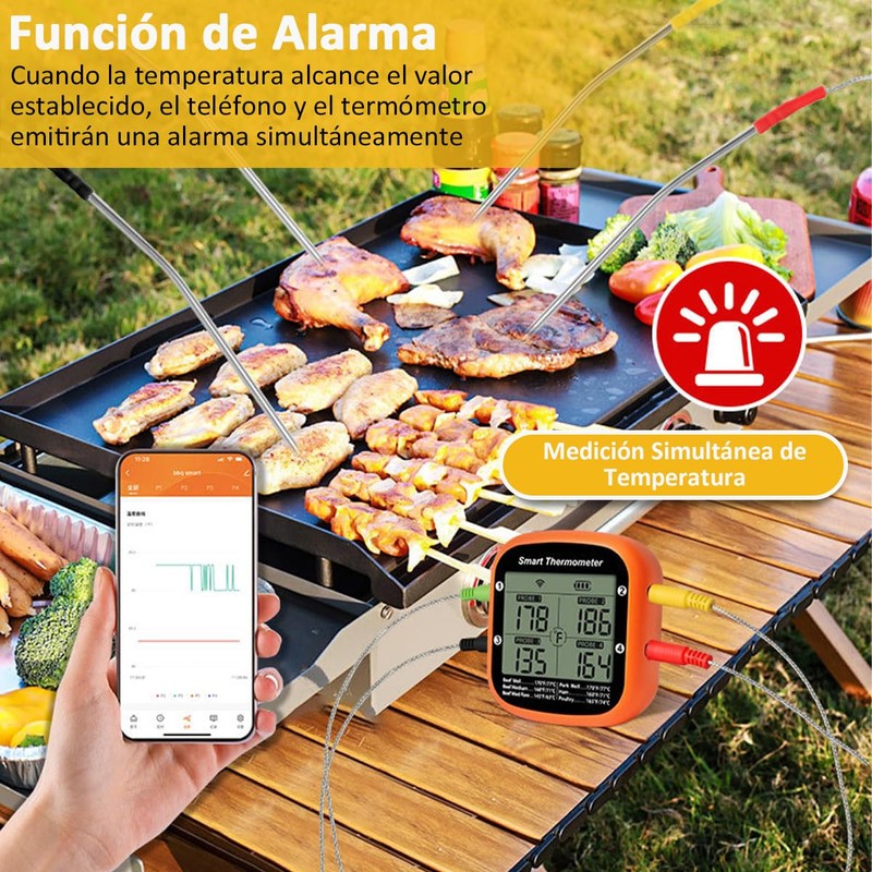 - 4 sondas que miden la temperatura simultáneamente: El termómetro para asador para barbacoa está equipado con 4 sondas que miden la temperatura simultáneamente. El thermometer facilita enormemente el control de la temperatura al cocinar. Cuando la temperatura alcance el valor establecido, el teléfono móvil y el termómetro emitirán una alarma simultáneamente para evitar que la comida se cocine demasiado y afecte su sabor.
