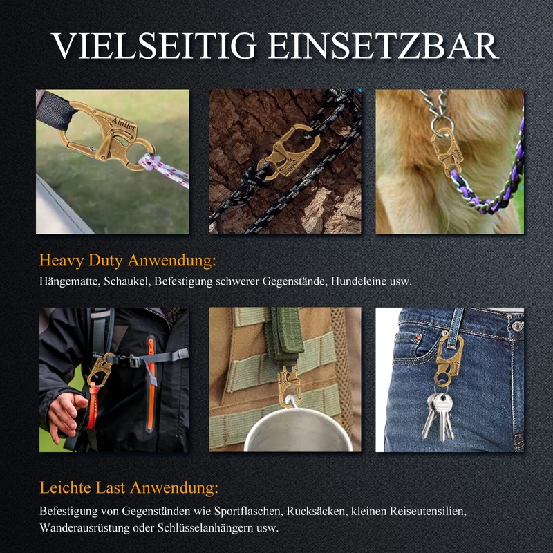 • 4. [Widely Used]: This unique safety carabiner not only has the general function of hanging items (such as tents, water bottles, keys, hammocks, decorations, dog leashes, etc.), but also has some survival functions (such as hammering windows, engraving, unpacking boxes, etc.). Use your observation skills - you will find it in many outdoor sports. Examples include travel, camping, hiking, climbing, hunting, etc.
