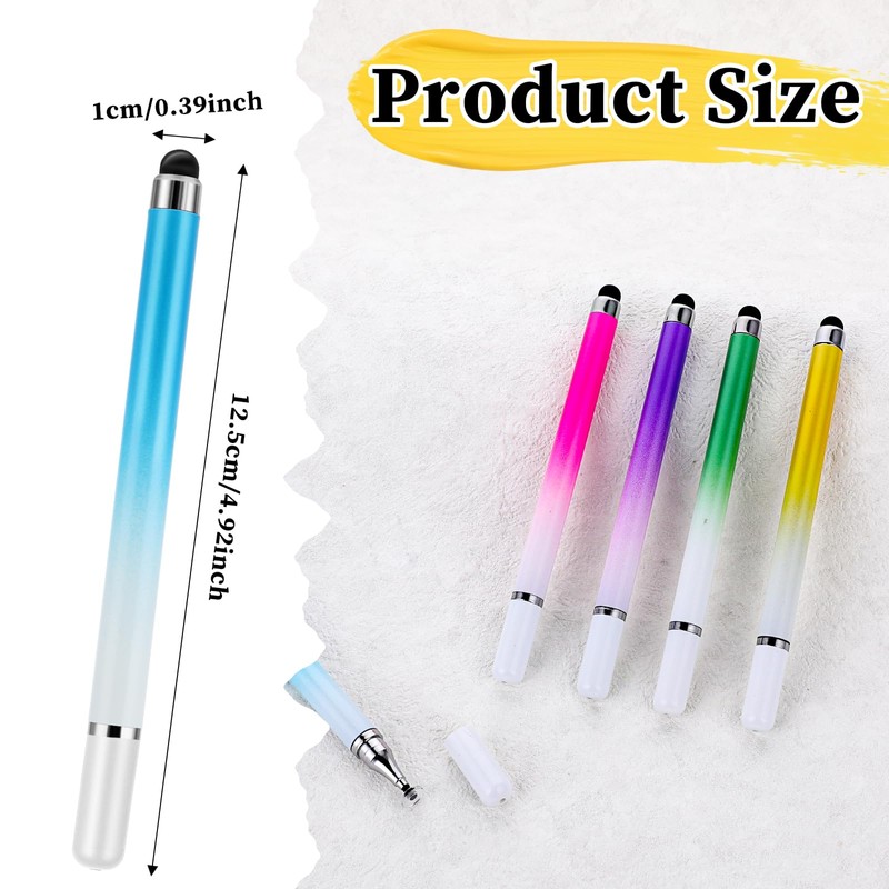 - Multi-coloured pen: 5 pieces touch pens in different colours, the size of the tablet pen is 12.5 x 1 cm and the pen for tablet has different tips at both ends. One end is a disc tip that is more precise and responsive when writing and drawing. The other end is a durable silicone tip for browsing or scrolling websites, which effectively protects the screen from fingerprints or stains.