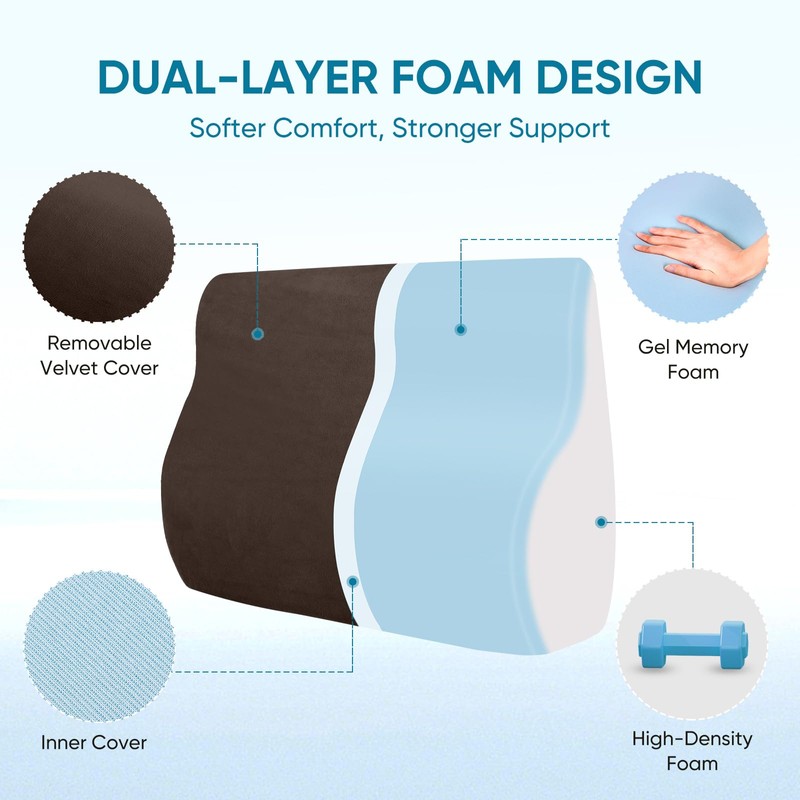 - Dual-Layer Foam: This lumbar pillow for recliner features a gel-infused memory foam top for plush softness and a high-density foam base for stable support, offering better comfort and structure than regular back cushion.