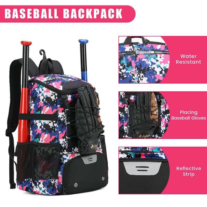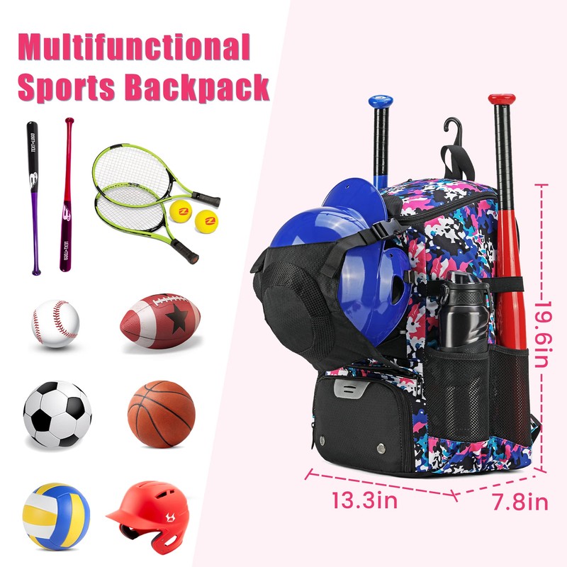 AI EN JIU Softball Equipment Bag for Youth Girls Adult, Lightweight Baseball Backpack with Shoe Compartment, Fence Hook for TBall Bat, Helmet(PinkCamouflage)