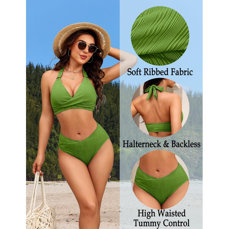 AI'MAGE Womens High Waisted Bikini Sets Tummy Control Two Piece Swimsuit 2025 Ribbed Color Block Halter Bathing Suits Green Medium