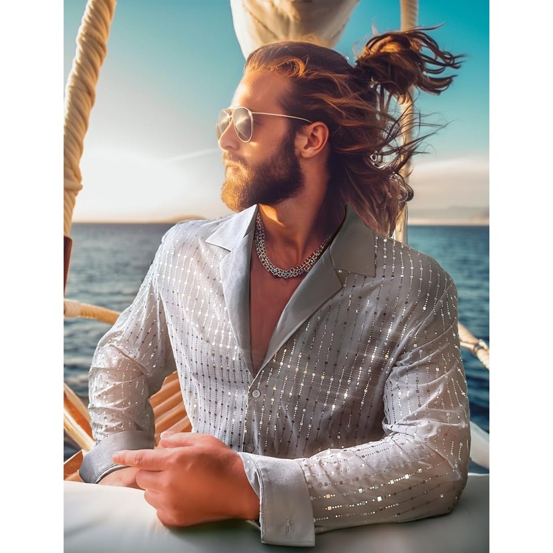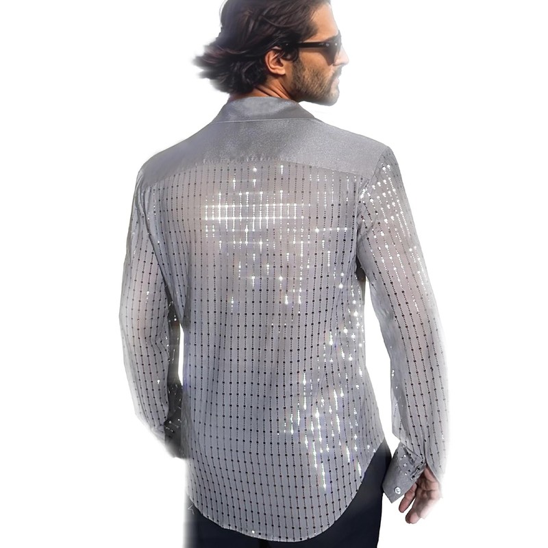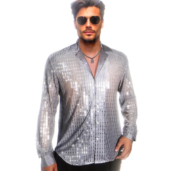 AIBEIX Mens Mesh Sequins See Through 70s Disco Long Sleeve Button Down Shirts(Grey Silver-Long Sleeve,Large)