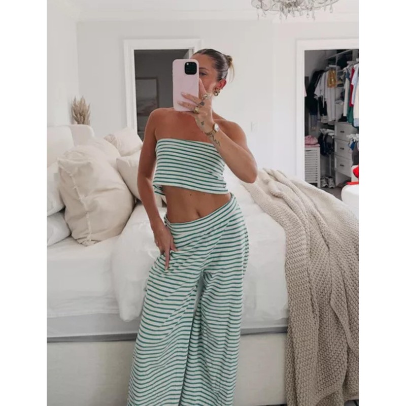 AICHARMWA Women's Striped Two Piece Sets Cropped Tube Top and Wide Leg Pants Lounge Matching set with Pockets(031-Green-S)