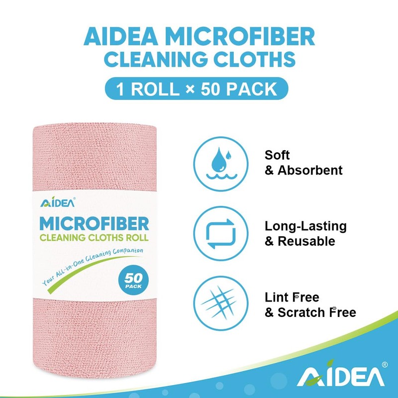 AIDEA Microfiber Cleaning Cloth Roll, 50PK, Tear Away Reusable Paper Towels Pink, Commercial Shop Rags, Microfiber Towels for Cars, Lint Free Cleaning Rags for House, Kitchen, Garage Shop, 11.5"×11.5"