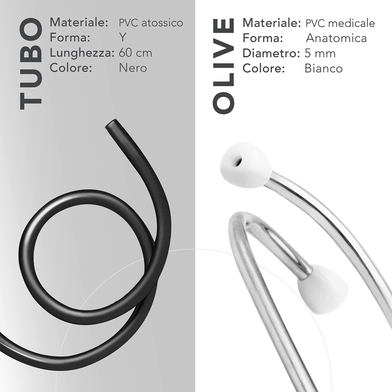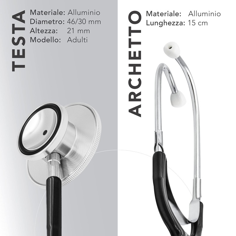 - Technical features: head material: aluminium. Dimensions: diameter 47/30 mm - h21 mm. Material of the bracket: aluminium. Length: 15 cm. Tube material: non-toxic PVC. Shape: Y length: 60 cm, outer diameter: 8.5 mm, inner diameter: 4 mm. Colour: black. Material of earpieces: medical PVC. Shape: anatomical. Diameter: 5 mm. Colour: white. Box dimensions: 190 x 10. 0x25 mm