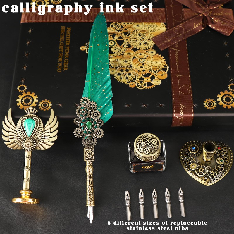 - 【Feather Pen Set Includes】1* quill pen,1* ink(Black),1* love pen holder,5* replaceable stainless steel nib,1* envelope,1* letter paper,1* bookmark,1* "gear design" Seal,1*color wax beads, 1*white wax,1*melting wax spoon,1*envelope opening tool,1*mechanical punk packaging box