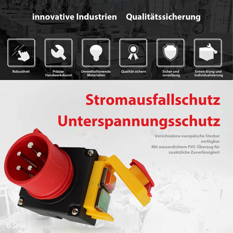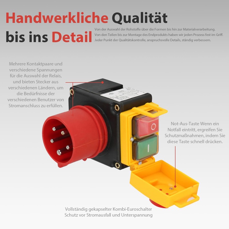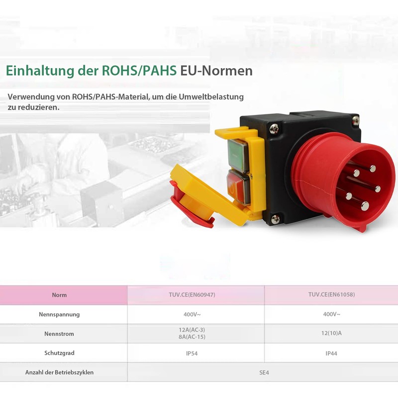 Emergency stop switch with 400 V 3-phase technology: professional motor protection switch for routers, table saws, electric drills and band saws. Technical specifications: AC-3 12A 400VAC 50Hz, AC-15 8A 400VAC 50Hz, IP54 protection class. Ideal for engines with up to 4.8 kW output power. TÜV-tested safety quality: All emergency stop switches are certified according to strict safety standards. The robust construction ensures long-term reliability in woodworking machines and industrial power tools. 【Automatic Shut-Off Function & Overload Protection】The emergency stop switch prevents risks caused by manual operation: short circuit and overload protection protect devices and users from damage. The red emergency stop button immediately interrupts the power supply in case of danger. Intelligent circuit protection with magnetic coil: Green start button activates the magnetic lock for continuous operation. In case of circuit interruption or short circuit, the electromagnet automatically triggers - maximum current safety for high speed cutting tools. Universal use with transparent cover: With clear protective housing for a clear view of switching conditions. Perfect for table routers, band saws, drills and all 400V power tools. Safety is always the first priority for fast rotation devices