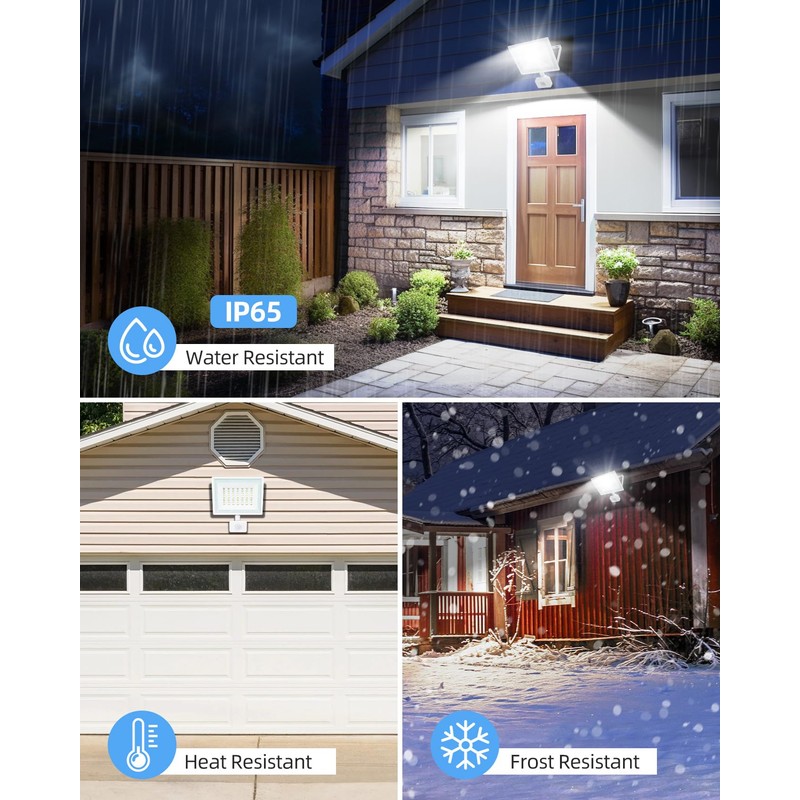 - IP65 Waterproof Outdoor Lights: The motion sensor light outdoor adopts IP65 waterproof technology to ensure that it can work perfectly in rainy or snowy conditions, providing great convenience and security for your life. Made of aluminum Die-casting, it offers insulation, safety, good heat dissipation, and corrosion resistance, prolonging the lamp's service life. It last up to 25000 hours! Perfect for outdoor use in gardens, garages, doorways, yards, docks, fences, etc.
