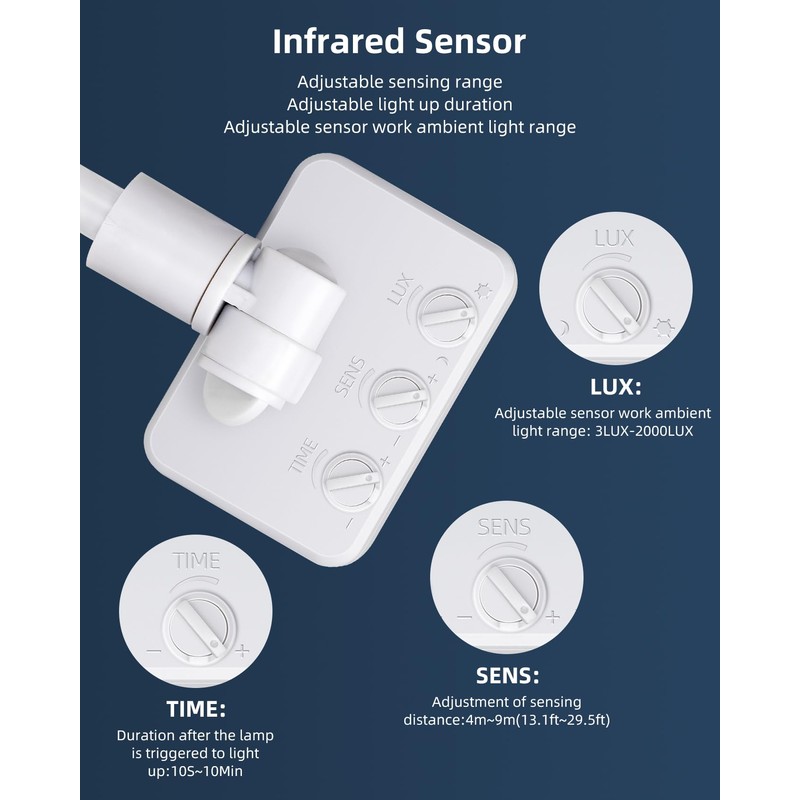 - Motion Sensor Lights Outdoor: Aigostar security light with an infrared sensor will light up when motion is detected within the sensor's range. The PIR detector is reasonably sensitive. On the back of the sensor, there are three buttons, you can adjust the distance at which motion will be detected (13~30FT), the time the light stays on (from 10S to 10 MIN) and the ambient light sensitivity (how dark it needs to be before the light will be triggered/triggered day+night. / triggered only at night)