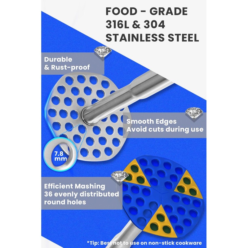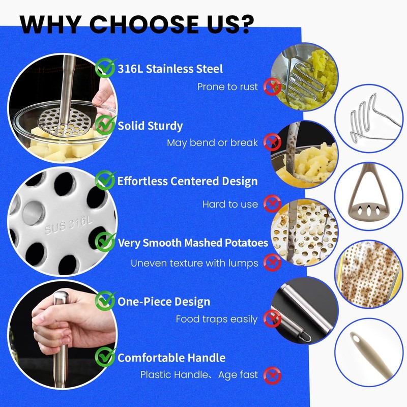 - Food-grade 316 & 304 Stainless Steel - The head of the potato masher is crafted from 316 stainless steel, and the handle is made from 304 stainless steel. These are food-grade stainless steel that provide excellent rust resistance for the potato masher and minimize bending or cracking during use. The masher kitchen tool features a one-piece design with a solid head that won't come loose. The head is finely finished with smooth, rounded edges to avoid cuts