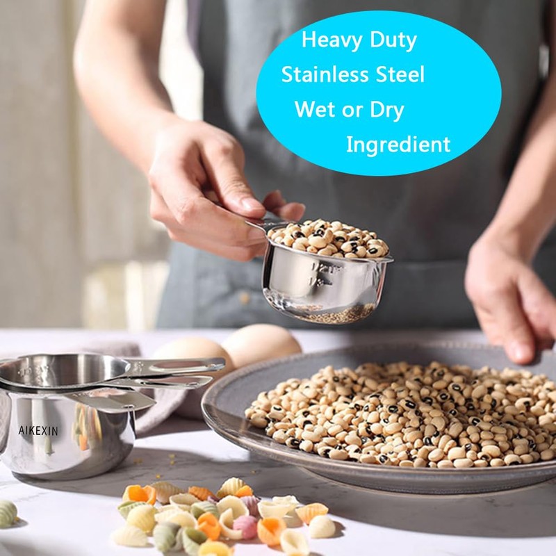 - [Premium Material]: Our metal measuring cups and spoons are made of high-quality food-grade stainless steel, rust-resistant. Liquid measuring cups are made from BPA-free food grade plastics, non-slip silicone handle and lipped design. Adding convenience to your cooking experience.