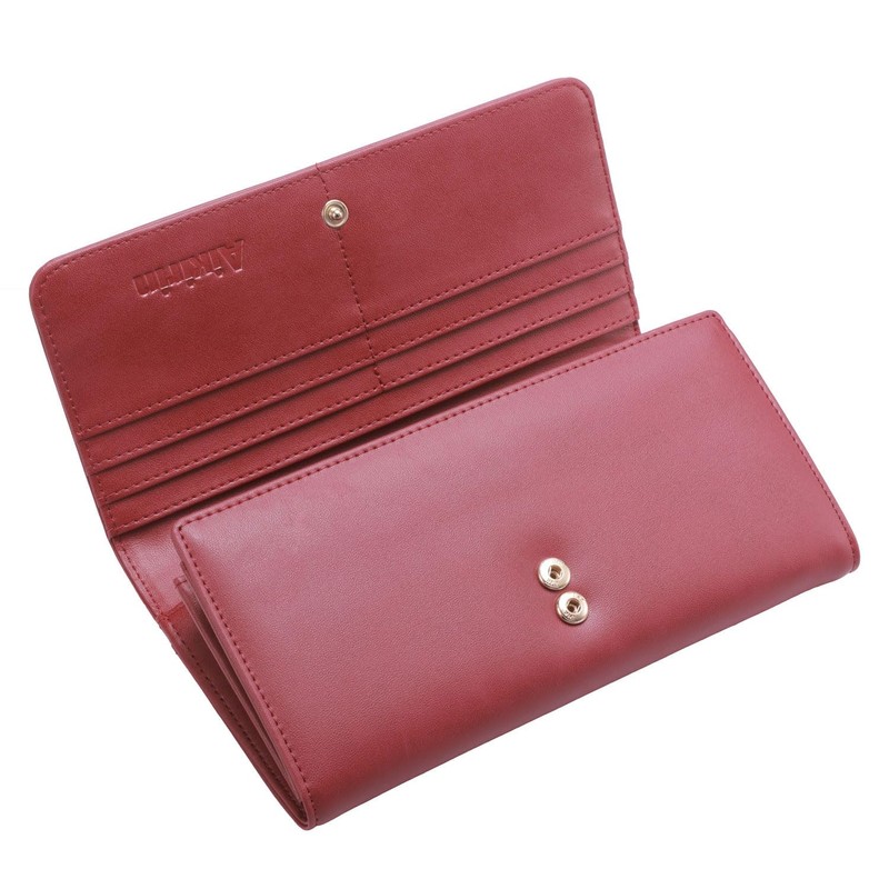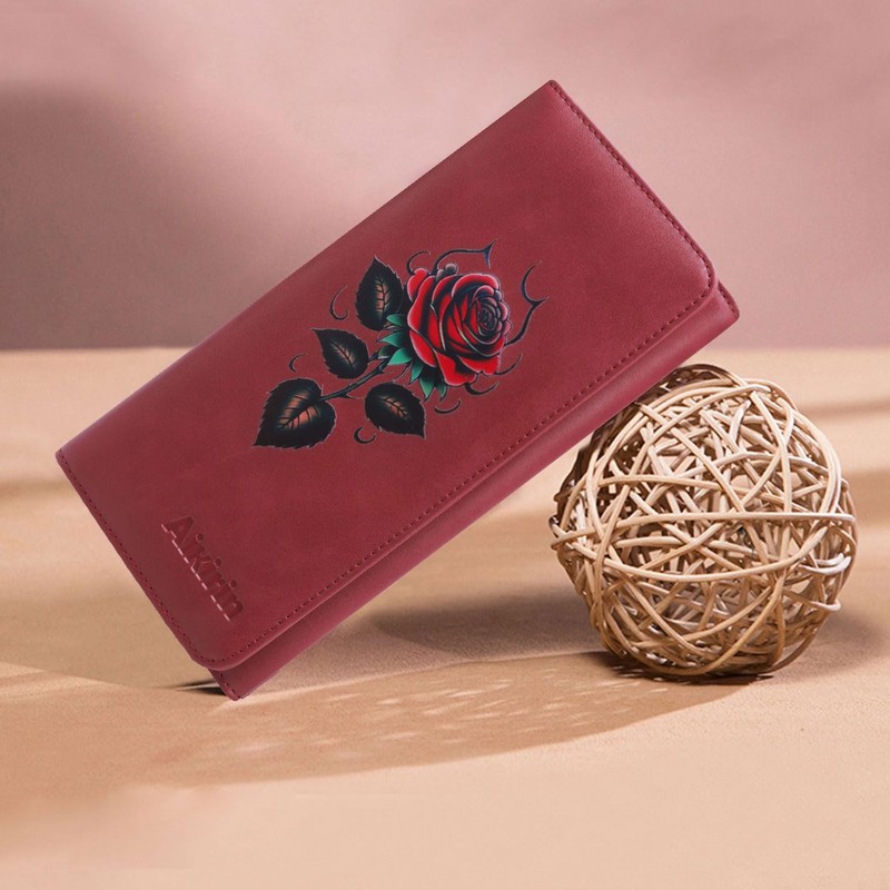 Aikirin RFID Leather Wallet for Women Painted Bifold Long Ladies Clutch Purse Credit Cards Holder Coin Pocket - 16 Card Slots (dark red-rose)