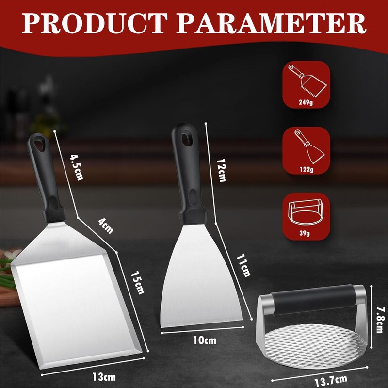 - For barbecue professionals: the AIKVIGSS stainless steel grill spatula set is the perfect accessory for barbecue enthusiasts and consists of burger press and two durable grill spatulas. Ideal for preparing burger press and hamburgers.