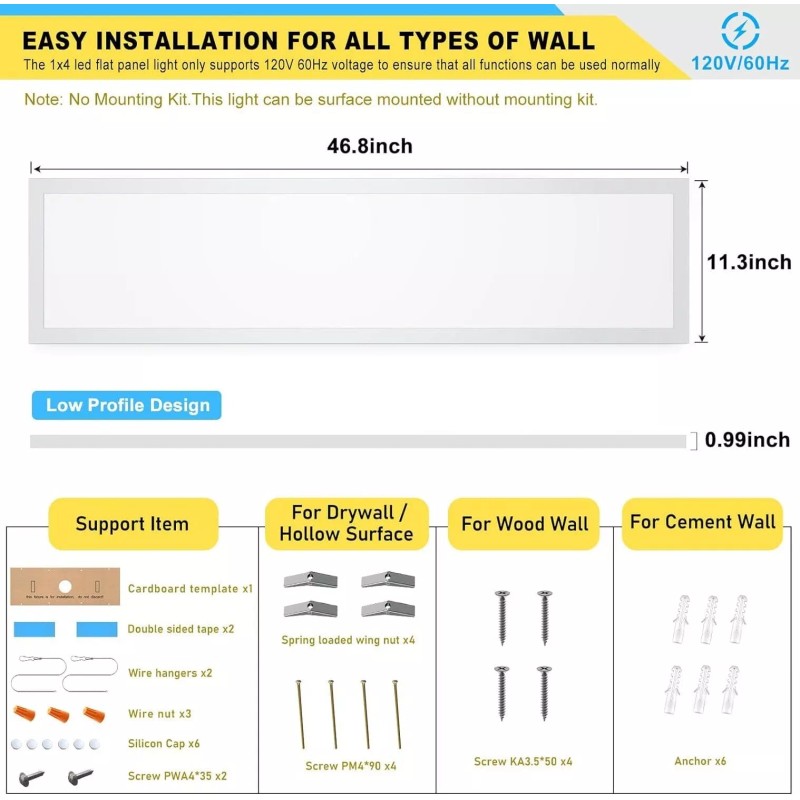 - Ultra Thin Design & Easy Installation: AIKVSXER flat panel LED lights have a stylish ultra-thin design profile (only 0.99 inches thick) that blends seamlessly into white ceilings when surface-mounted. Its understated look easily fits into any modern space. The 48 Inch LED Light Fixture comes with screws and can be installed easily on cement, wood or cavity walls.