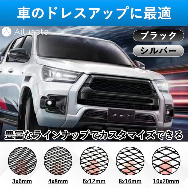 - Perfect for aerodynamic processing and dressing up your car: This aluminum mesh net cover can be used for aerodynamic processing and front grilles. Available in black and silver colors and 5 patterns for you to choose from 3mm x 6mm / 4mm x 8mm / 6mm x 12mm / 8mm x 16mm / 10mm x 20mm. Great for customizing bumpers, body kits, fenders, hood vents, vehicle openings and more as a dress up auto part. It can also be used for DIY projects such as computer and rain gutters