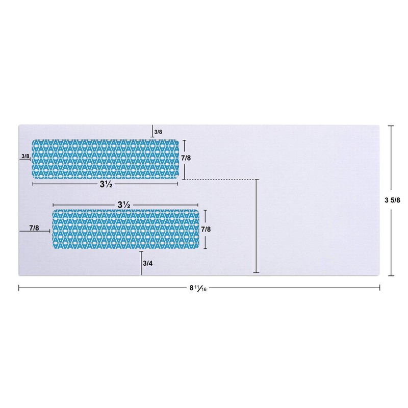 - DUAL WINDOW CUSTOM DESIGNED FOR MAILING BUSINESS CHECKS: Top Window height is 7/8 inch X 3-1/2 inches wide and is positioned 3/8 inch from the left and 2-3/8 inch from the bottom, Bottom Window height is 7/8 inch X 3-1/2 inch wide and is positioned 7/8 inches from the left and 3/4 inches from the bottom