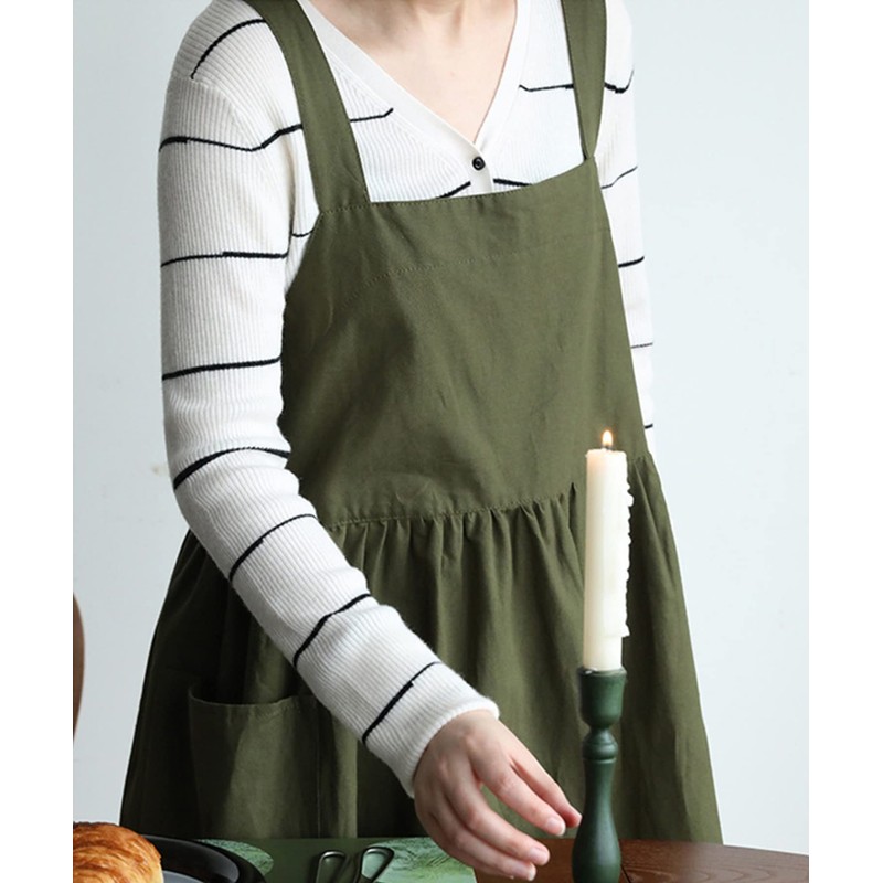 Aimoha Cafe Apron, Flare, One-Piece Apron, Women's, Gardening, 100% Cotton, Natural Cafe Style Apron, Green