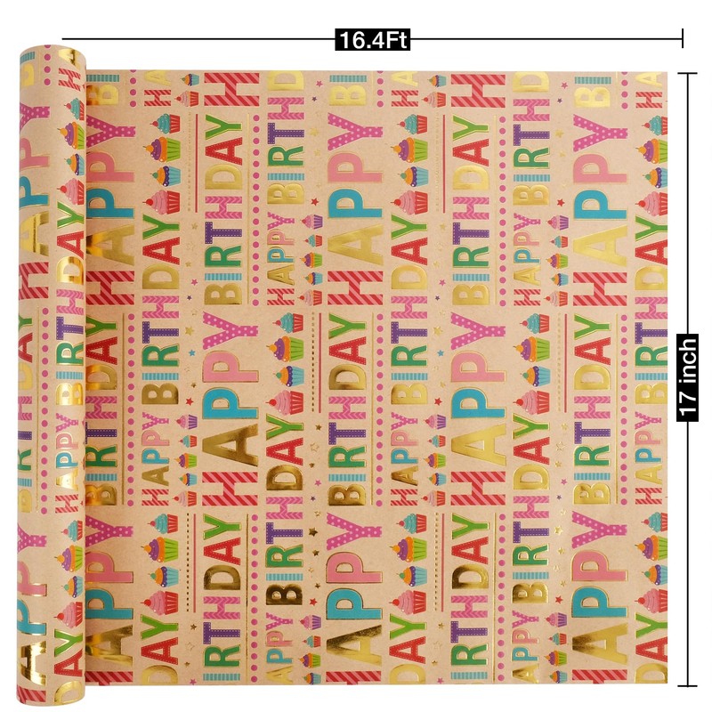 Aimyoo Colorful Birthday Wrapping Paper Roll - 17 Inch X 16.4 Feet - Gold Foil Happy Birthday Lettering & Cupcake Design Gift Wrap for Kids, Baby Showers