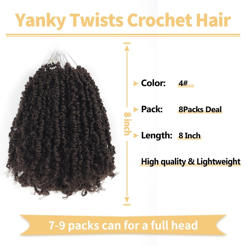 Ainimiu Yanky Twist Crochet Hair - 8Inch 8 Packs (20 Strands/Pcs) Pre-twisted Fluffy Spring Mini Twist Short Passion Twist, Ombre Brown Pre-Looped Crochet Braids Braiding Hair