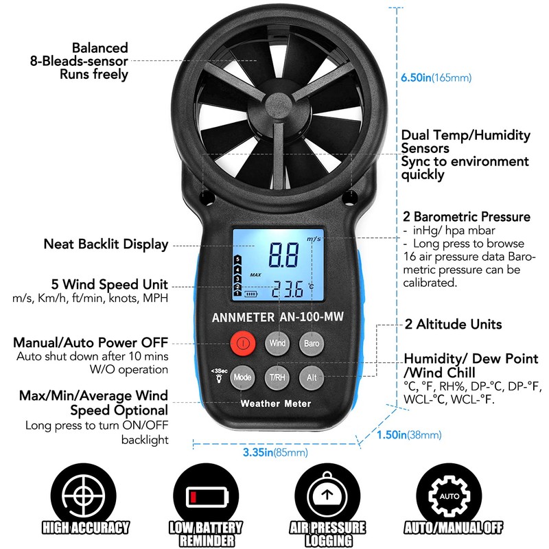 - Versatile Wind Speed Gauge and Weather Measurement Tool- Multifunctional measures wind speed, wind temp, altitude, tmospheric pressure, humidity. Ideal weather gauge for boat, sailing, hiking, etc outdoor activities.