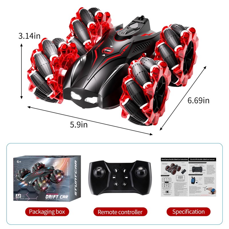 - [All Directional Drift Cool Stunt] High-tech remote control stunt car can rotate 360 ° and double sided driving, drive on both sides, spray and automatically demonstrate. The cool lighting and unlimited functions provide children with a wonderful operating experience and visual effects.