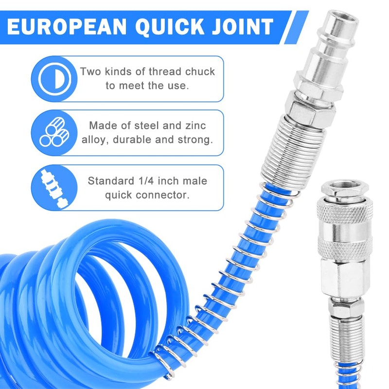 【DURABLE MATERIAL】The air hose is made of polyurethane (PU), flexible, anti-knot, can quickly recover its shape, abrasion-resistant, oil-resistant, more durable and lightweight, the connector is electroplated iron.
