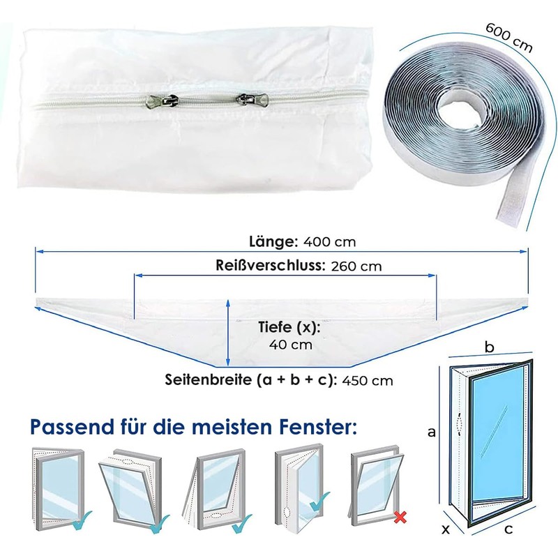 • Easy installation: everything you need for your window seal is included. Simply apply the tape to the inner frame of the window and to the window itself. Attach the sealing fabric to the tape. Then open the zip and run the hose of your air conditioner out of the window. Finally, close the zip around the hose and tighten it. Simplicity and efficiency guaranteed
