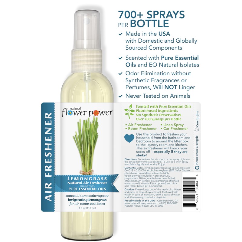 - ROOM, LINEN & CAR SPRAY – Natural Flower Power Air Fresheners can be used as a room spray, linen spray, or car mist. The fresh scents are great for the bathroom, bedrooms, gym bags, rugs, pillows, & more! They are available in 4 scents - Peppermint & Lemon, Lemongrass, Citrus & Spice, & Lavender, and we offer various variety pack options!