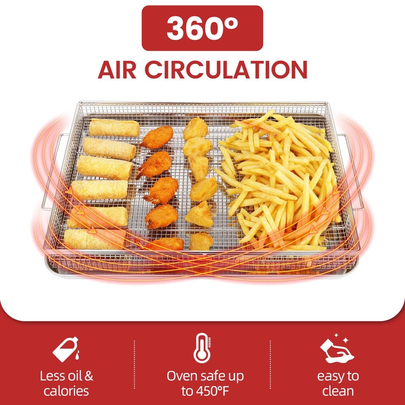 - 【Air Fry Everything in Your Oven】 Geesta cripser tray with upgraded raised basket is more stable and less wobbly, and the basket will not slide across the baking pan. Mesh crisper basket allows the convection heat to reach every angle of the food and 360 degree airflow circulation, without needing to flip your food.