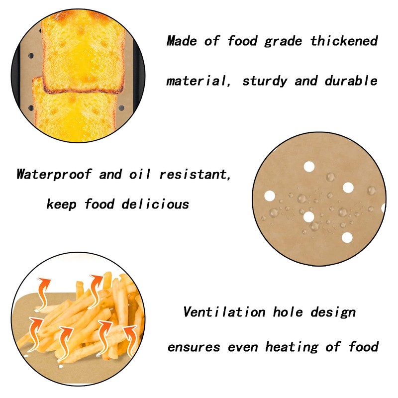 - Unbleached Food-Grade Material – Crafted from natural wood pulp, these air fryer liners offer a grease-resistant, water-resistant surface that holds up well under high heat. Ideal for healthy cooking without the mess, they help maintain flavor and texture while being safe for food touch.
