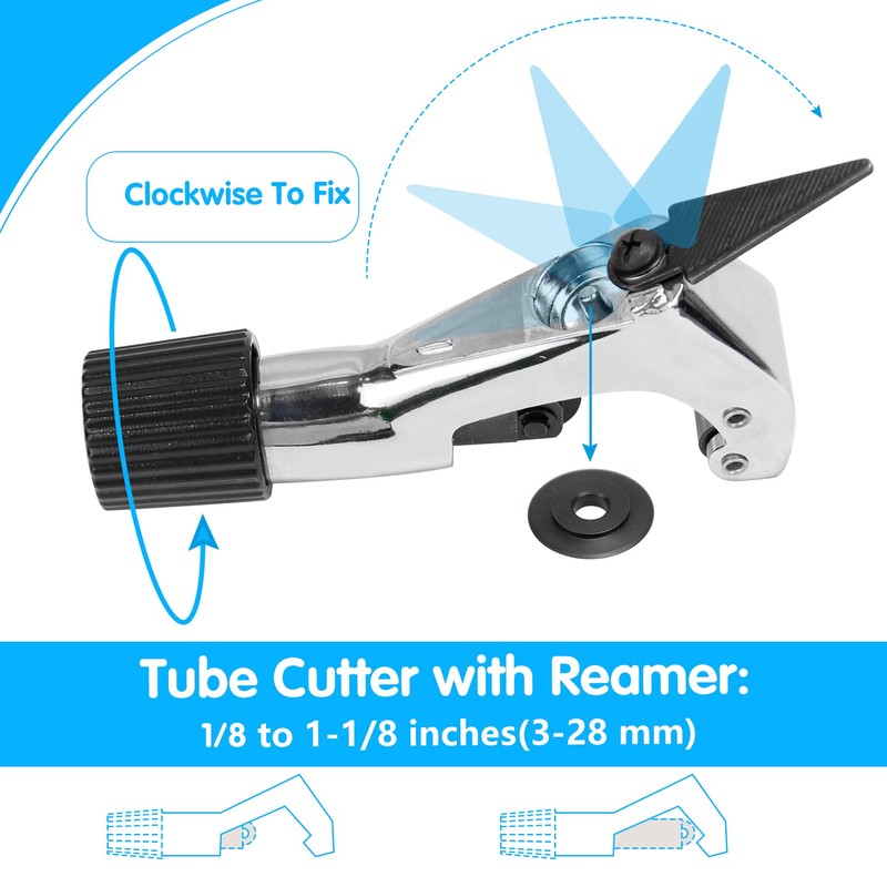 - ✅【UNIVERSAL SIZE】This tube bender kit equips with 7 different tube bender heads to meet your needs. Suitable for tubing O.D. size of 1/4, 5/16, 3/8, 1/2, 5/8, 3/4, 7/8 inches (6, 8, 10, 12, 16, 19, 22mm). Pipe cutter with reamer and additional blade capacity: 1/8 to 1-1/8 in (3-28mm).