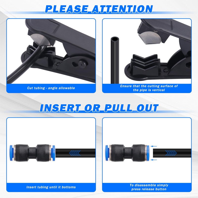 - EASY TO INSTALL - Push to connect air fittings assortment is a simple push in design and easy to be installed. Release rings at the top could be pushed down easily when inserting the tube into the coupler and bouncing up immediately when taking out the tube. Cutting tool is included for meeting your tube length requirements