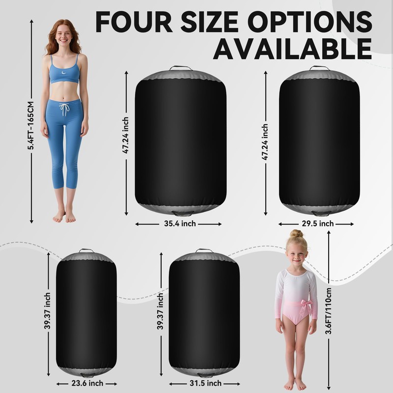 - Multiple Colors & Sizes: Our gymnastics air roller come in a variety of colors and sizes (23.6/31.5/29.5/35.4 inch) to meet different training needs. we provide different sizes for different training ,Large size for group training or professional gymnastic, small size for home entertaiaunment use or daily training.