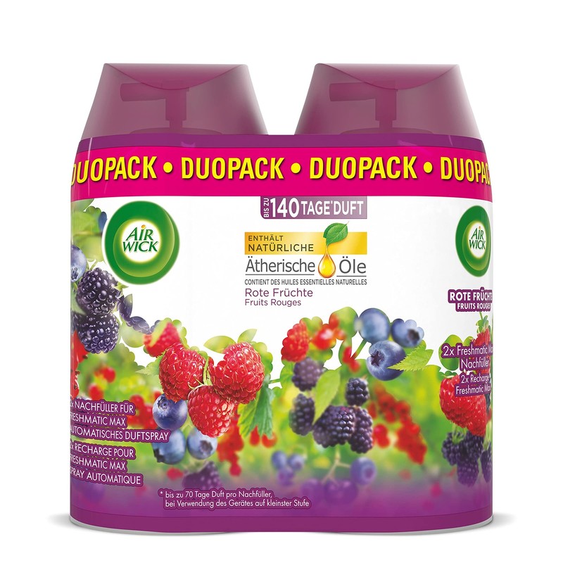 - Contents: 2 x 250 ml Air Wick room spray refill for Air Wick Freshmatic Max. Fragrance: Red fruits. Compatible with most standard devices.