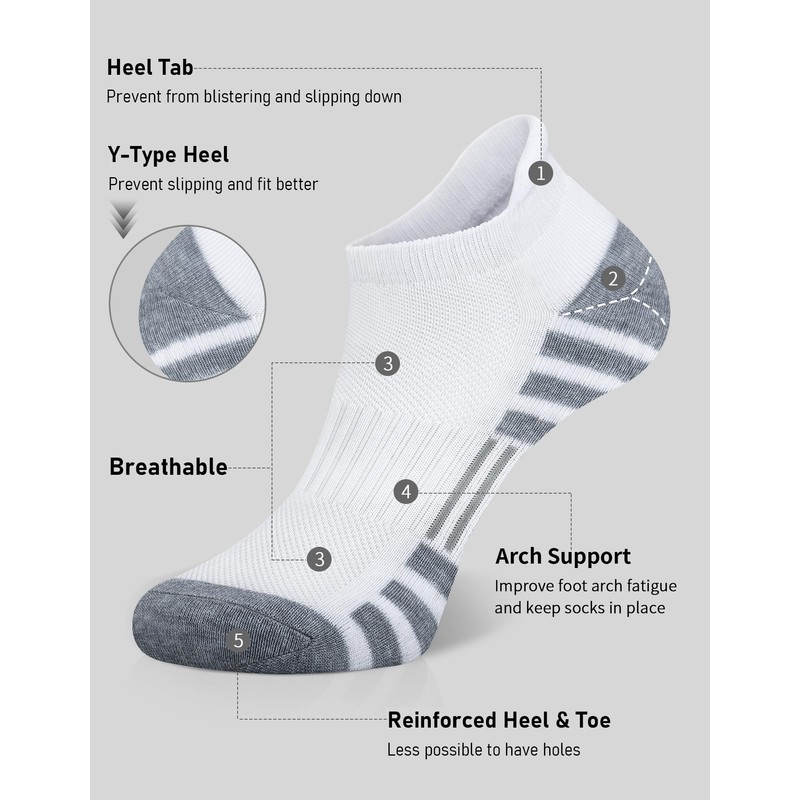 - Non Slip Off & Arch Support - Our low cut tab socks have suitable compression in arch to protect you when you walk, jog and run and increase stability for a perfect fit. Elastic cuff tab can lock the heel and make sure our sports socks non-slip in order to avoid athletic sock sliding from your daily walking, running, cycling, hiking, tennis, soccer.