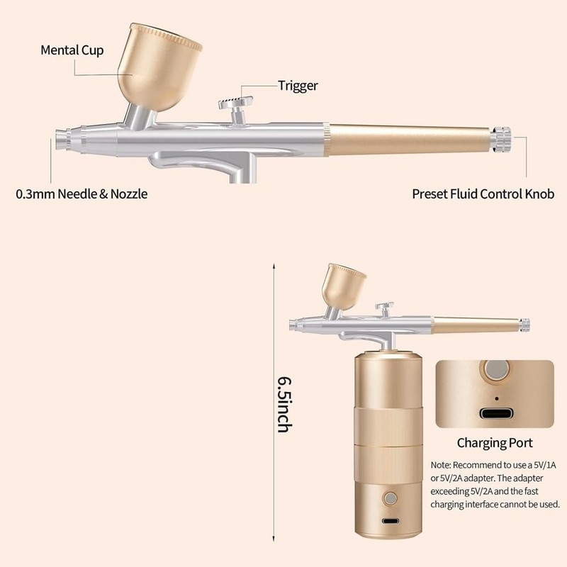 - The rechargeable battery provides long-term continuous use, just charge via USB socket using a power bank, laptop or any USB charger (Type-C). There is an indicator light on the main body of the wireless airbrush to show the charging status. This portable airbrush allows you to unleash your artistic skills anytime, anywhere. Note: Please be sure to use a 5V/1A or 5V/2A adapter to avoid damaging the battery.